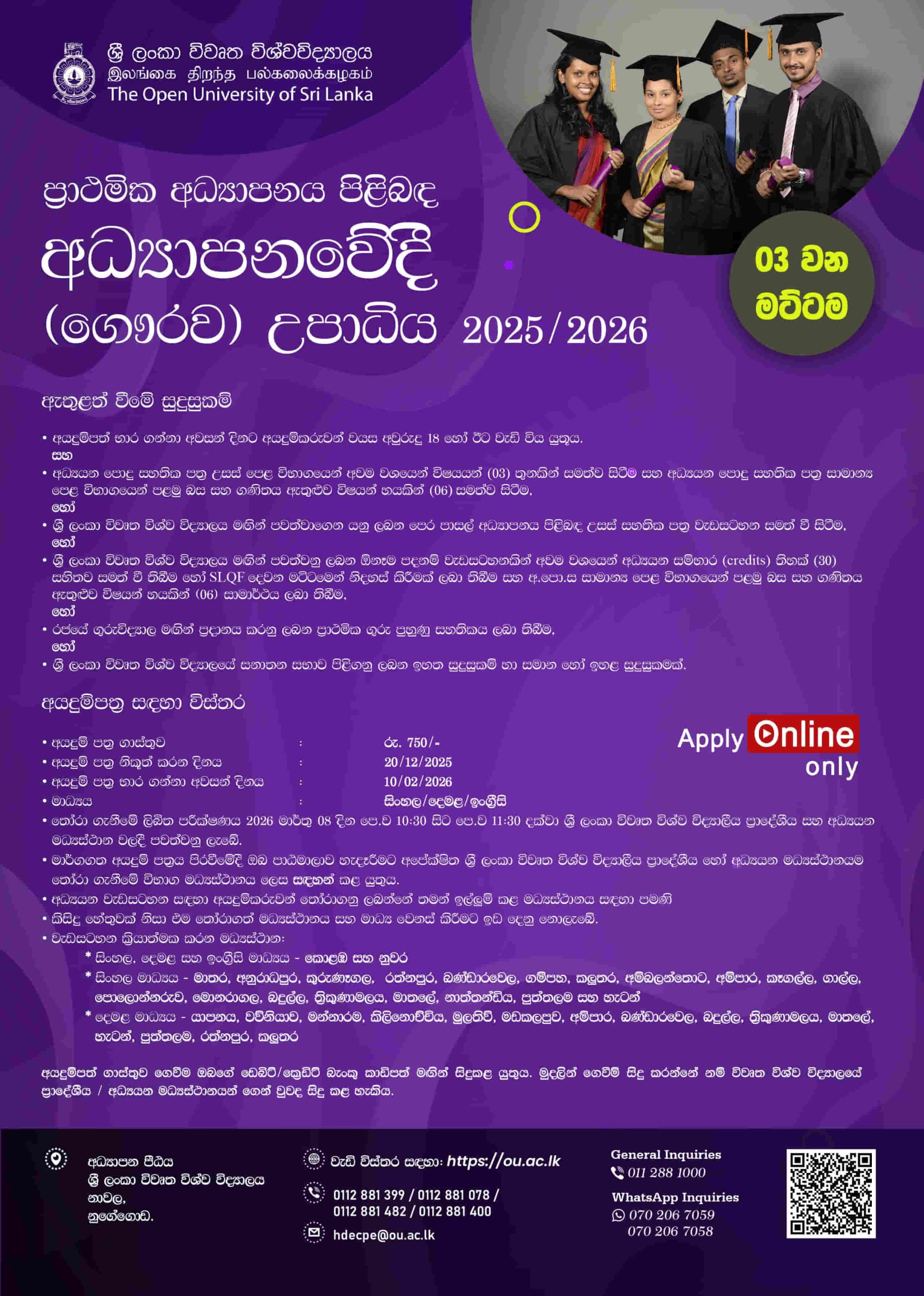 - Apply Online: Visit https://ou.ac.lk/programme/bachelor-of-education-honours-in-primary-education-degree-programme/ before Feb 10th